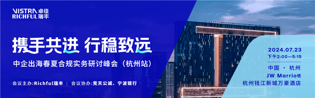 “攜手共進,行穩(wěn)致遠:中企出海春夏合規(guī)實務研討峰會”活動于今日7月23日下午在杭州錢江新城萬豪酒店成功舉辦。本次峰會由Richful瑞豐發(fā)起和主辦,聯(lián)合Vistra卓佳、競天公誠、寧波銀行協(xié)辦,吸引了近百位來自華東地區(qū)的企業(yè)高管報名參會。