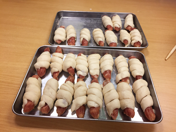 然后就是臘腸卷,人手搓成的面團包上臘腸,只要放入蒸籠就大功告成。