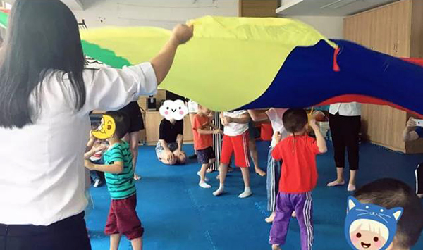 帶著孩子們玩彩虹傘抓小魚的游戲,孩子們的笑臉是對我們最好的回報