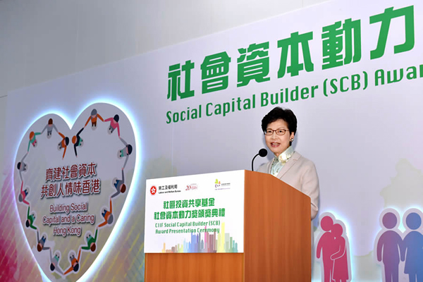 林鄭月娥女士第三度為頒獎(jiǎng)禮擔(dān)任主禮嘉賓。她致辭時(shí)表示,社會(huì)資本的理念已逐步深入社區(qū),愈來愈得到社會(huì)各界支持和認(rèn)同?;鹩?jì)劃在幫助參與者之余,也能夠令“受助者”轉(zhuǎn)化為“助人者”,延續(xù)傳承互助文化,并能提升居民彼此間的互信、對社區(qū)的歸屬感,長遠(yuǎn)而言能夠促進(jìn)社區(qū)解決困難的能力。