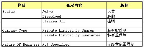從這個頁面上您可以看到公司的名稱和注冊地址(Name & Registered Office), 公司的注冊號碼(Company No.),公司狀態(tài)(Status),成立時間(Date of Incorporation),公司類型(Company Type),公司營業(yè)性質(zhì)(Nature of Business),報(bào)稅日期(Next Accounts Due),年審日期(Next Return Due)。