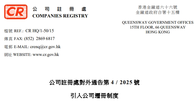 為鞏固香港國際商業(yè)及金融中心的地位,政府通過《2025年公司(修訂)(第2號)條例》(下稱《修訂條例》)引入公司遷冊制度。