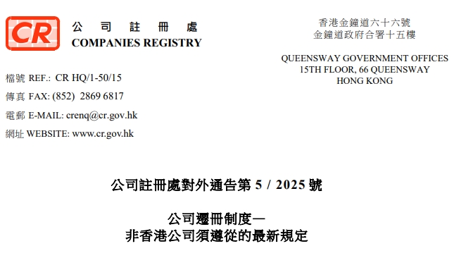 《公司條例》(第622章)已作出修訂,引入新的公司遷冊制度,讓非香港法團遷冊來港。在《2025年公司(修訂)(第2號)條例》(下稱《修訂條例》)內(nèi)的相關(guān)法例修訂,已于2025年5月23日實施。