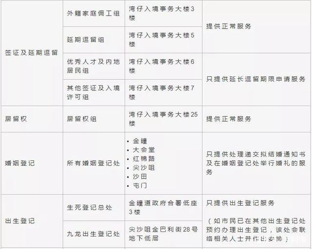上述各辦事處將按正常辦公時(shí)間提供服務(wù),而個(gè)別辦事處的具體辦公時(shí)間請(qǐng)參閱入境處的官方網(wǎng)站或流動(dòng)應(yīng)用程式 。至于入境處其他辦事處包括各區(qū)智能身份證換領(lǐng)中心,以及其他各項(xiàng)公共服務(wù),則將會(huì)繼續(xù)暫時(shí)停止開(kāi)放和提供服務(wù)。