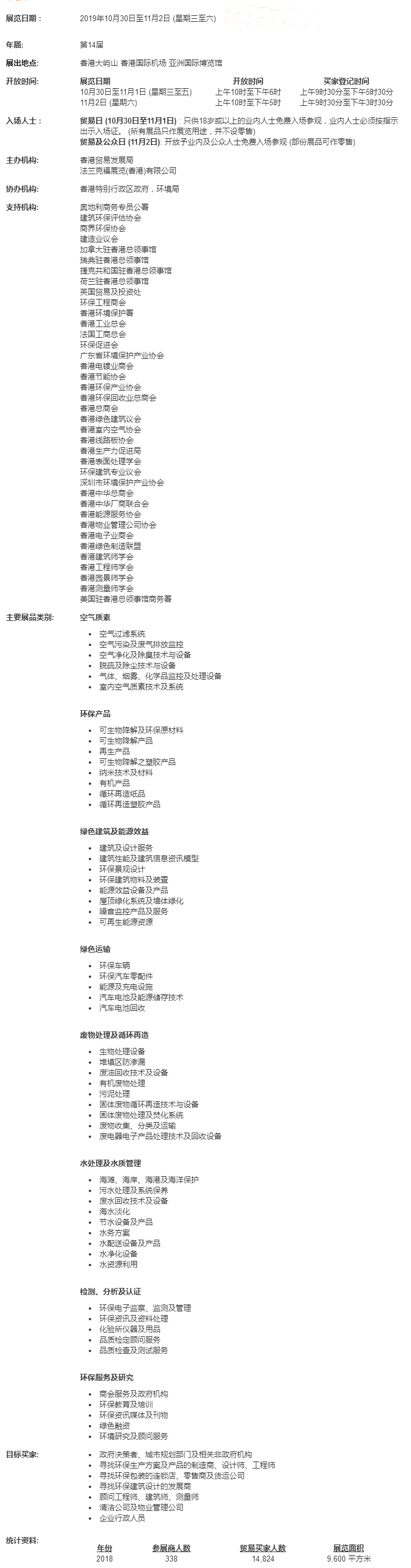 國(guó)際環(huán)保博覽是亞洲環(huán)保行業(yè)的優(yōu)質(zhì)商貿(mào)平臺(tái),展示最新的環(huán)保產(chǎn)品、設(shè)備和先進(jìn)技術(shù)。博覽由香港特區(qū)政府環(huán)境局協(xié)辦,通過香港、中國(guó)內(nèi)地及國(guó)際政府部門和行業(yè)商會(huì)的鼎力支持,為環(huán)保行業(yè)提供企業(yè)對(duì)政府(B2G)和企業(yè)對(duì)企業(yè)(B2B)層面的商機(jī)。