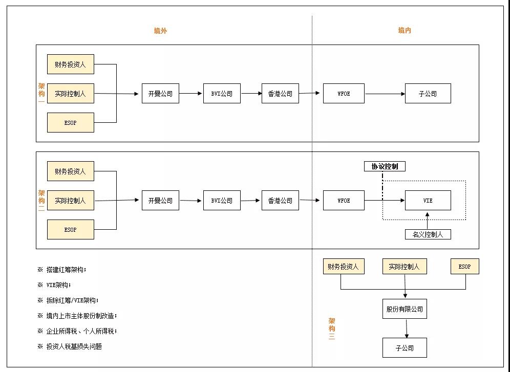 為實現(xiàn)境外上市,企業(yè)會面臨將公司從純內(nèi)資變?yōu)榧t籌架構(gòu)或VIE的情況,問題通常包括: