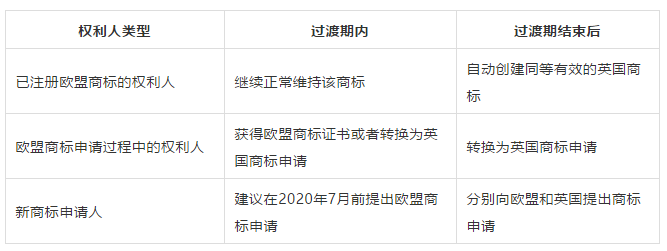 在過(guò)渡期內(nèi)到注冊(cè)期限、需要續(xù)展的歐盟商標(biāo),需要及時(shí)進(jìn)行續(xù)展。已注冊(cè)的歐盟商標(biāo)將在過(guò)渡期滿后,英國(guó)知識(shí)產(chǎn)權(quán)局都將會(huì)自動(dòng)創(chuàng)建同等有效的英國(guó)商標(biāo)。