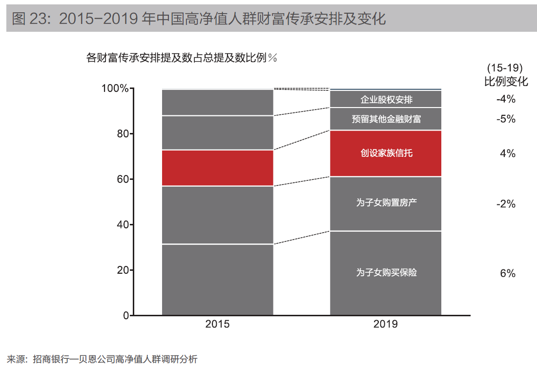 根據(jù)《2019中國(guó)私人財(cái)富報(bào)告》顯示,家族信托在高凈值人士的各類財(cái)富傳承安排方式中增長(zhǎng)最快,提及率從2015年的16%提升至2019年的20%??梢?jiàn),家族信托所具備的稅務(wù)籌劃、財(cái)富保障與傳承功能的優(yōu)勢(shì)越來(lái)越受到重視。