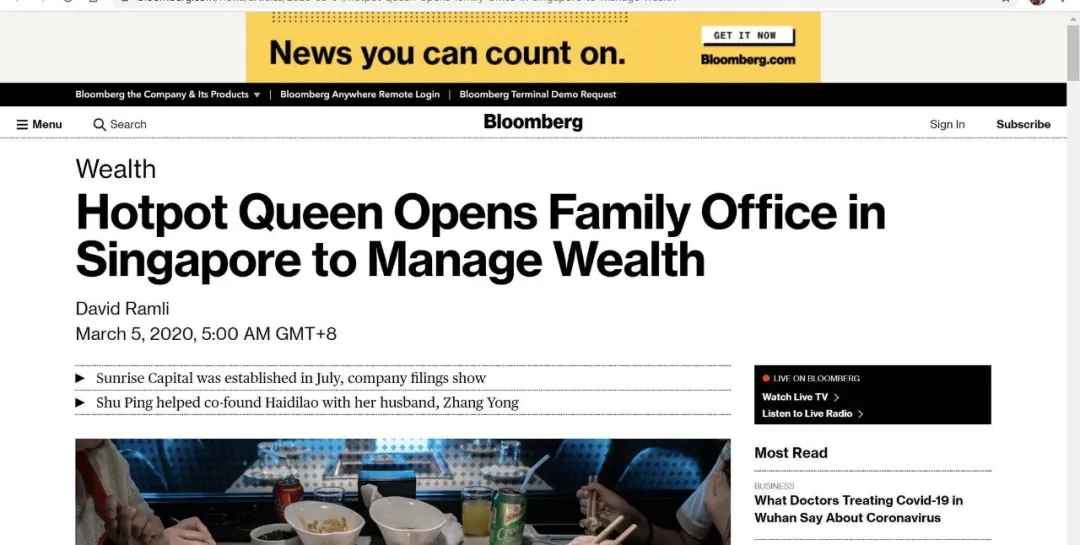 2020年3月5日彭博社Bloomberg在財(cái)富專欄的一篇報(bào)導(dǎo)《火鍋女王在新加坡設(shè)立家族辦公室以管理財(cái)富》,迅速將全球最大的火鍋連鎖店海底撈送上了熱搜。