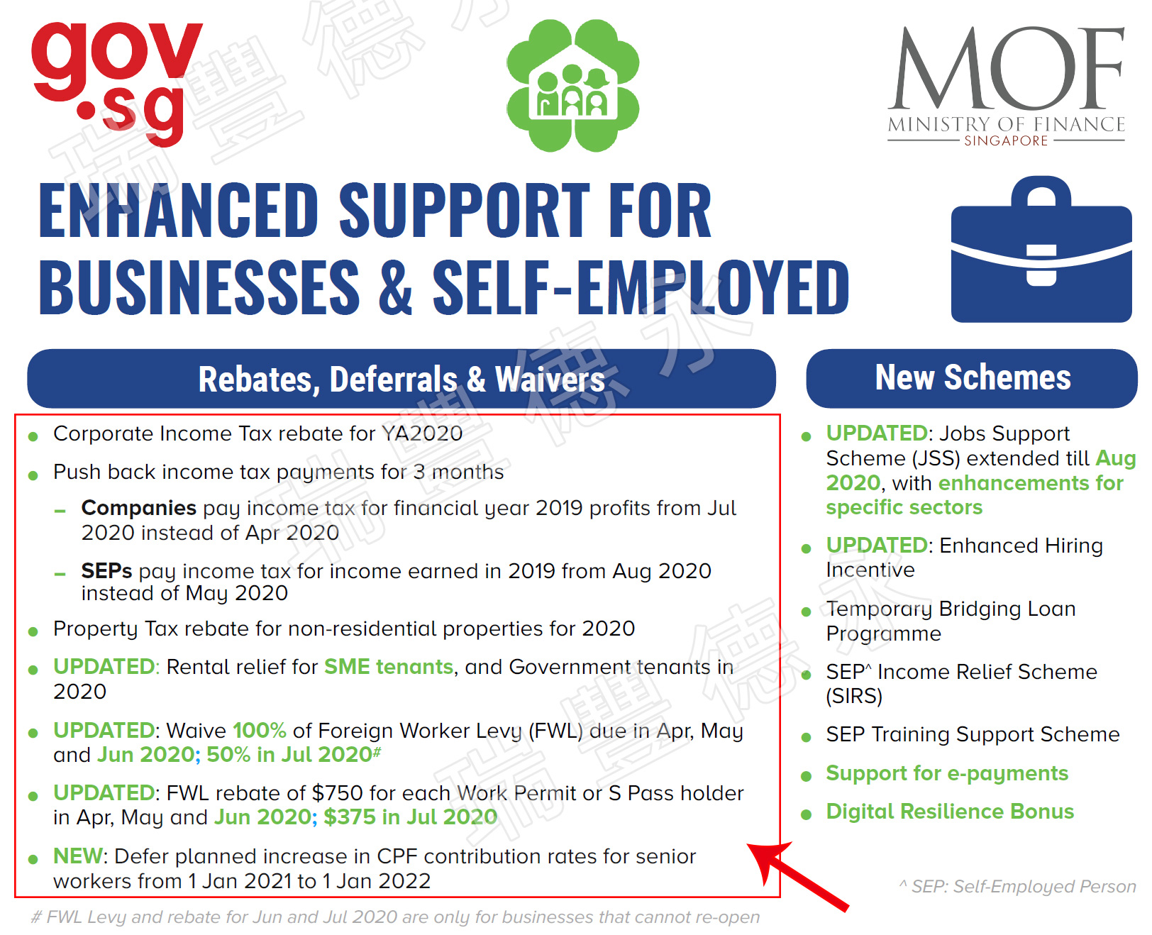● 2020年4月~6月,對(duì)已獲工作許可證或S pass的外國(guó)職工,每人返還750新幣,7月返款375新幣