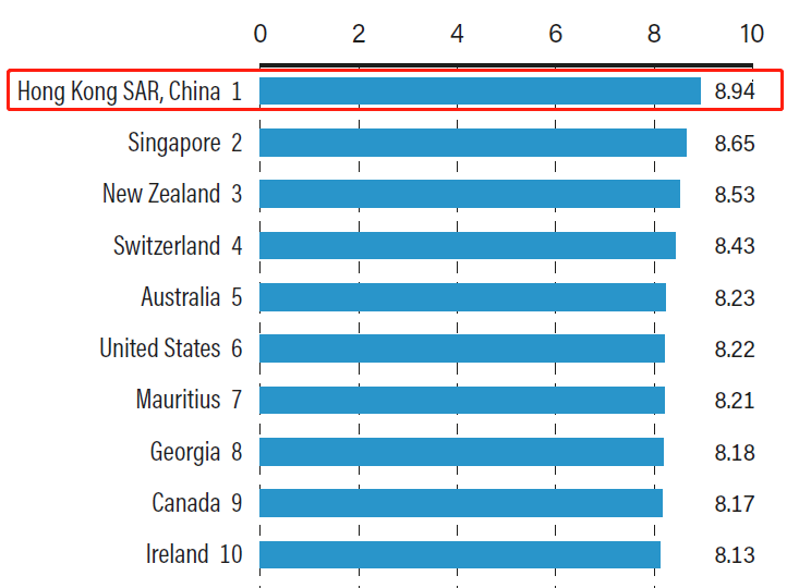 這份報告的最新綜合數(shù)據(jù)以2018年的為基礎(chǔ),香港以8.94分的綜合評分,再次位居榜首,新加坡、新西蘭分別以8.65分與8.53分位居第二與第三。
