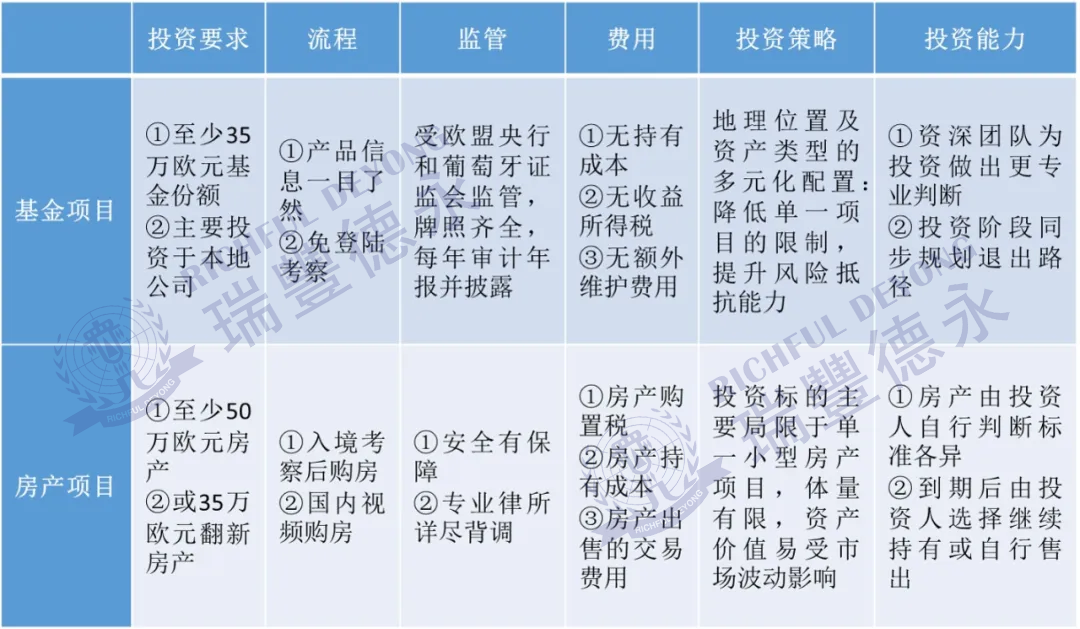 根據(jù)葡萄牙政策規(guī)定,其“黃金居留許可證”可通過2個項目獲?。和顿Y房產(chǎn)和投資基金。