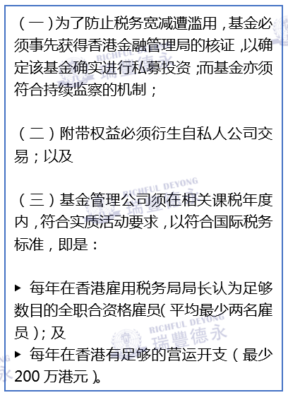目前為了進一步香港鞏固香港私募基金樞紐的優(yōu)勢,特區(qū)政府立法會將實施當初承諾的第二步驟:為在香港營運的私募基金所分發(fā)的「附帶權(quán)益」提供稅務寬減。但有關附帶權(quán)益必須符合若干條件,方可獲得稅務寬減,其中包括: