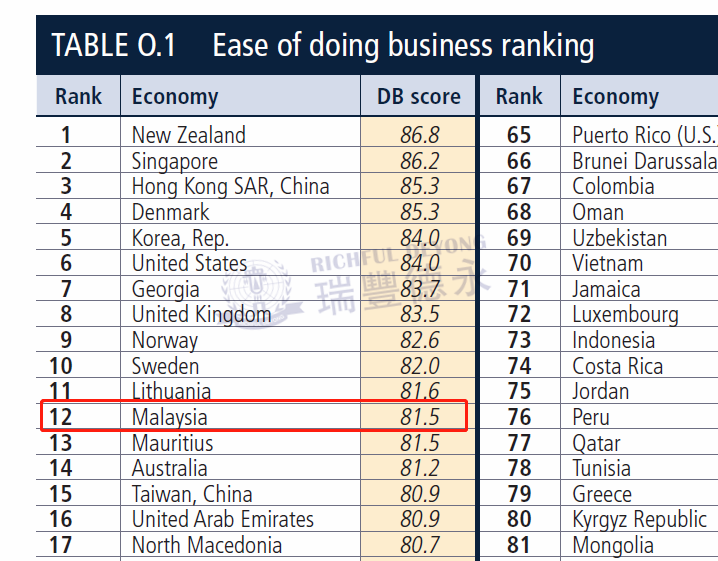 根據(jù)世界銀行《2020年全球營商環(huán)境報(bào)告》(Doing Business 2020)顯示,馬來西亞營商環(huán)境在全球190個(gè)經(jīng)濟(jì)體中排名較去年上升3位,列第12位,在東盟地區(qū)僅次于新加坡。