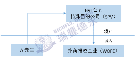在返程投資架構(gòu)中,以上圖為例,A先生為中國(guó)內(nèi)地自然人,在BVI注冊(cè)了一家離岸公司,匯發(fā)[2014]37號(hào)文中將其稱之為“特殊目的公司”(SPV),A先生以BVI公司作為股東,回到中國(guó)投資注冊(cè)一家外商獨(dú)資企業(yè)(WOFE)。