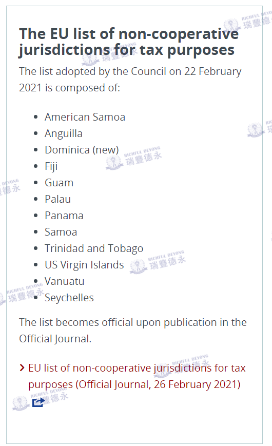2021年2月22日,歐盟理事會(huì)在其官網(wǎng)上發(fā)布一則公告:就經(jīng)修訂的「出于稅收目的的歐盟非合作管轄區(qū)清單」(俗稱“黑名單”)通過(guò)了結(jié)論,歐盟決定將多米尼加(Dominica)加入該名單中,同時(shí)將巴巴多斯(Barbados)移出“黑名單”。