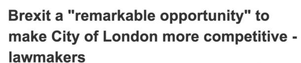 而英國(guó)路透社報(bào)道近日指出,“英國(guó)脫歐,將成為倫敦金融城更具競(jìng)爭(zhēng)力的千載難逢機(jī)遇?!?span lang="EN-US">