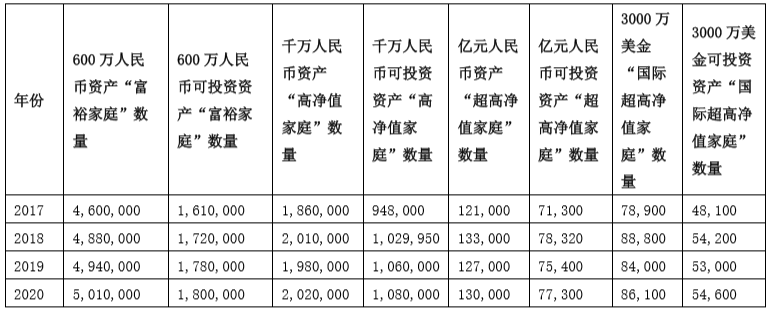 根據(jù)《2020胡潤(rùn)財(cái)富報(bào)告》的數(shù)據(jù)顯示,2020年中國(guó)600萬資產(chǎn)“富裕家庭”數(shù)量首次突破500萬戶,比上年增加1.4%;千萬資產(chǎn)“高凈值家庭”比上年增加2%至202萬戶;億元資產(chǎn)“超高凈值家庭”比上年增加2.4%至13萬戶。