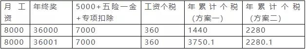 1、工資(年累計)>扣除數(shù)(年累計),年終獎在36000元以下的選擇方案一劃算些