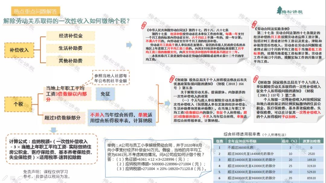 財稅【2018】164號第五條第一項:個人與用人單位解除勞動關(guān)系取得一次性補償收入(包括用人單位發(fā)放的經(jīng)濟補償金、生活補助費和其他補助費),在當(dāng)?shù)厣夏曷毠て骄べY3倍數(shù)額以內(nèi)的部分,免征個人所得稅;超過3倍數(shù)額的部分,不并入當(dāng)年綜合所得,單獨適用綜合所得稅率表,計算納稅。