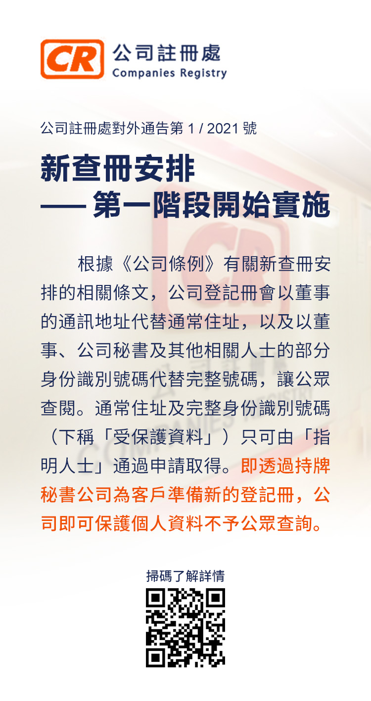 1、只有公司董事和秘書的通訊地址,以及董事、公司秘書和其他相關(guān)個人的部分身份識別碼,才會顯示在公司注冊處保存的公司登記冊中。這適用于新的查冊制度開始后提交的文件。