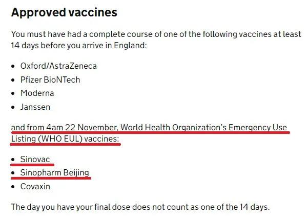 在日前更新的規(guī)則中,盡管英國政府從11月22日起認(rèn)可中國的疫苗,但是在疫苗接種證明的認(rèn)可國家或地區(qū)中,暫時尚未列出中國的名字。按照英國政府通常的做法,預(yù)計將于11月22日前更新承認(rèn)的疫苗證明國家或地區(qū)名單,屆時從中國內(nèi)地來英國、完成中國疫苗接種的旅客,將更加自由。