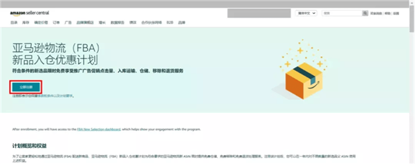 (1)登陸亞馬遜賣家平臺(tái),訪問該計(jì)劃活動(dòng)頁,點(diǎn)擊頁面中的“立即注冊”按鈕,即可加入該計(jì)劃。您發(fā)送商品到亞馬遜運(yùn)營中心之前,必須先注冊該計(jì)劃,才有機(jī)會(huì)享受計(jì)劃中的費(fèi)用優(yōu)惠。