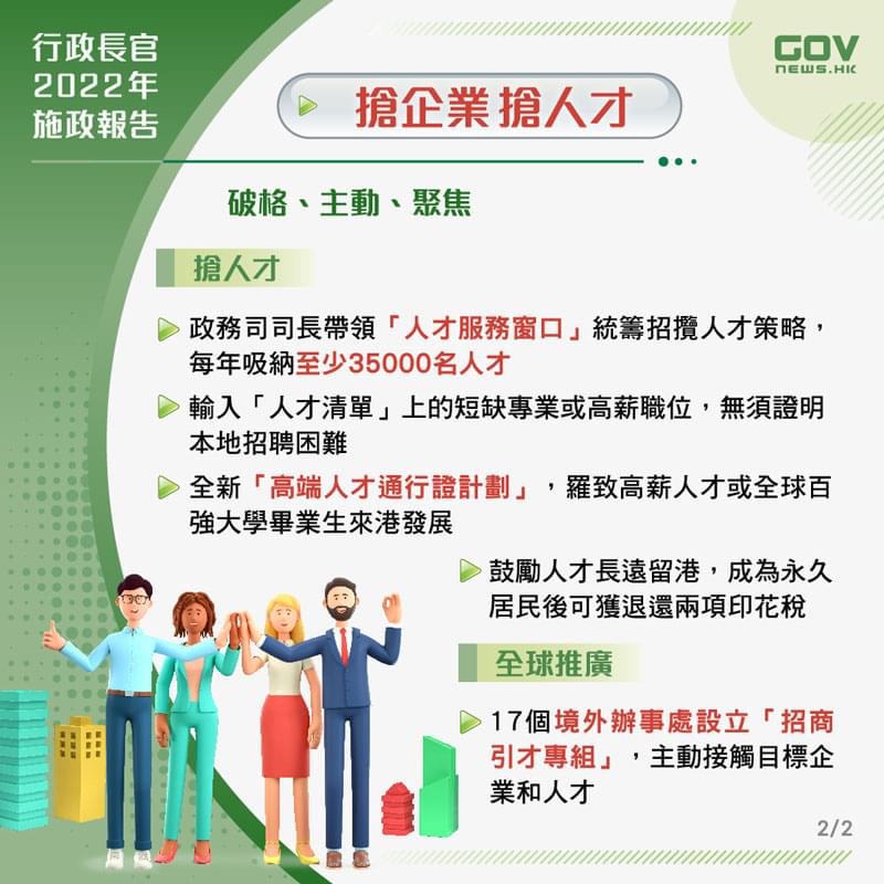 2022年10月19日,香港新任特首李家超發(fā)布第一份《施政報告》,李家超在施政報告中提出一系列新措施,招商引資引才,強(qiáng)化香港競爭力。香港政府將成立多個單位,專責(zé)招攬企業(yè)和人才來港發(fā)展,并優(yōu)化多項輸入人才計劃,加強(qiáng)吸引力。