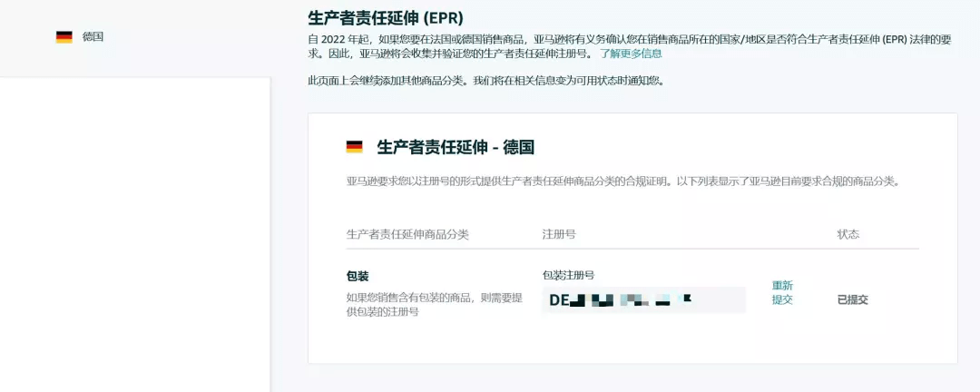 在此階段,您只能為德國的包裝分類添加 LUCID 編號(hào)。如果您銷售的產(chǎn)品符合其他EPR商品分類,您也需要對(duì)其進(jìn)行注冊(cè)并上傳。亞馬遜預(yù)計(jì)將在2022年2月為法國賣家提供上傳鏈接,德國的電子與電氣設(shè)備(WEEE)預(yù)計(jì)將會(huì)在2022年3月開放收集,屆時(shí)將通知您。