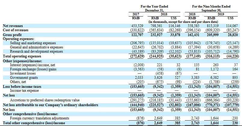 此次招股書增加了2019年第三季度的財務(wù)數(shù)據(jù)。截至9月30日,荔枝2019年前三季度的凈收入為8.15億元,同比(較上年同期)增長46%。報告期內(nèi)凈虧損為1.04億元,同比擴(kuò)大817%。2019年前三季度,荔枝毛利為2.06億元,同比2018年前三季度的1.62億元,增長了27%。