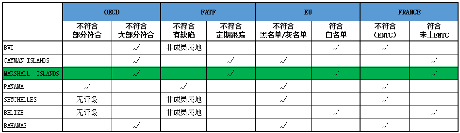 目前,在國(guó)際上對(duì)于離岸屬地進(jìn)行合規(guī)評(píng)級(jí)的主要有歐盟ECOFIN,國(guó)際經(jīng)合組織(OECD)以及反洗錢(qián)金融特別工作組(FATF)。而在國(guó)內(nèi)常見(jiàn)的離岸屬地中,同時(shí)加入各機(jī)構(gòu)評(píng)級(jí)又都在白名單上的海外屬地只有馬紹爾群島