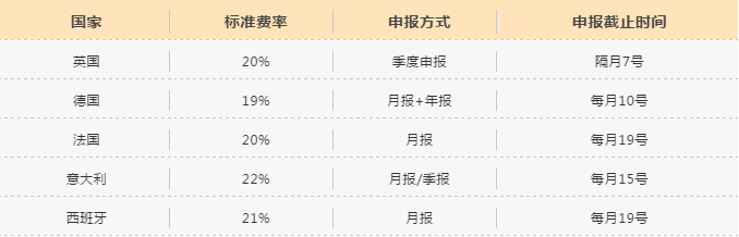 以英國為例,除了零稅率外,還包含一般稅率和低稅率。絕大多數(shù)賣家銷售的商品都是一般稅率,它的標(biāo)準(zhǔn)費(fèi)率為20%,而對于年銷售額小于15萬英鎊的賣家則可以申請低稅率,首年內(nèi)可享受6.5%固定稅率,次年可享受到7.5%固定稅率。各國的稅率、申報方式與時間節(jié)點(diǎn)都略有不同,以下圖表是各國VAT標(biāo)準(zhǔn)費(fèi)率與申報時間。