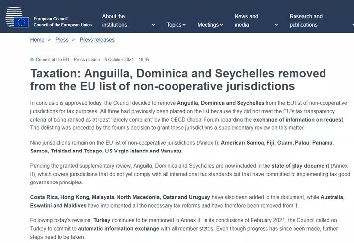 10月5日,歐盟公布了2021年的第二份“稅務(wù)不合作司法管轄區(qū)名單”(EU list of non-cooperative jurisdictions for tax purposes,即“黑名單”),宣布將安圭拉、多米尼加和塞舌爾從歐盟不合作名單中刪除。