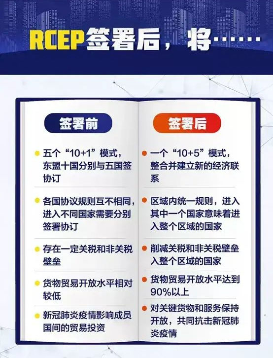 RCEP是一個(gè)綜合性自由貿(mào)易協(xié)定,由東盟十國在2012年發(fā)起,歷經(jīng)八年談判,于2019年11月4日完成談判,并于2020年11月15日正式簽署“區(qū)域全面經(jīng)濟(jì)伙伴關(guān)系協(xié)定”(RCEP)。2021年11月2日,成立自由貿(mào)易協(xié)定RCEP,該協(xié)議將于2022年1月1日起正式生效。