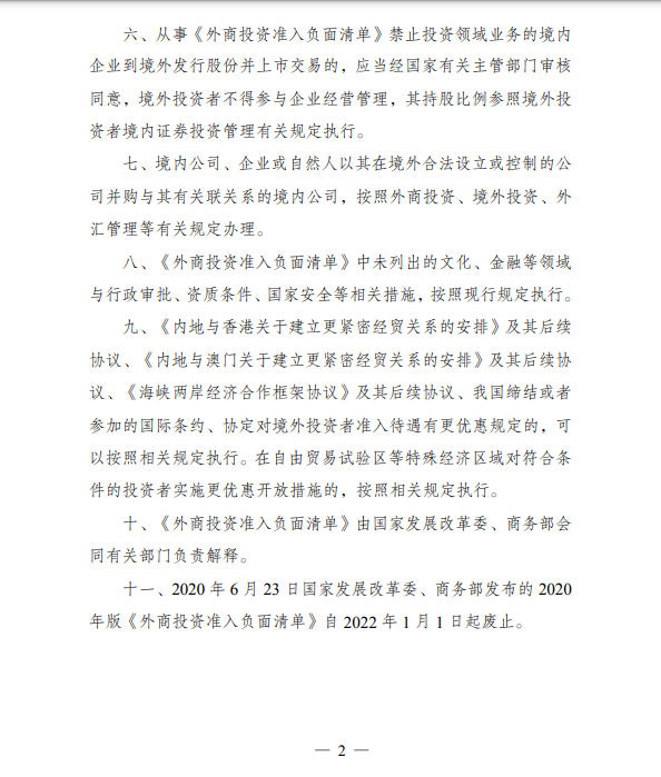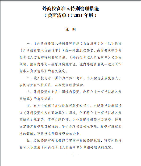 《外商投資準入特別管理措施(負面清單)(2021年版)》已經(jīng)在2021年9月18日國家發(fā)展和改革委員會第18次委務會議審議通過和商務部審簽,并經(jīng)黨中央、國務院同意,自2022年1月1日起施行。