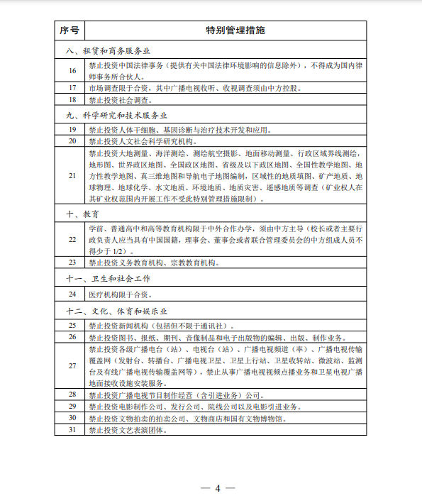 第三,提高外資準入負面清單精準度。在負面清單說明部分增加“從事外資準入負面清單禁止投資領域業(yè)務的境內(nèi)企業(yè)到境外發(fā)行股份并上市交易的,應當經(jīng)國家有關主管部門審核同意,境外投資者不得參與企業(yè)經(jīng)營管理,其持股比例參照境外投資者境內(nèi)證券投資管理有關規(guī)定執(zhí)行”,由證監(jiān)會和有關主管部門按規(guī)定對從事負面清單禁止領域業(yè)務的境內(nèi)企業(yè)到境外上市融資實行精準化管理。
