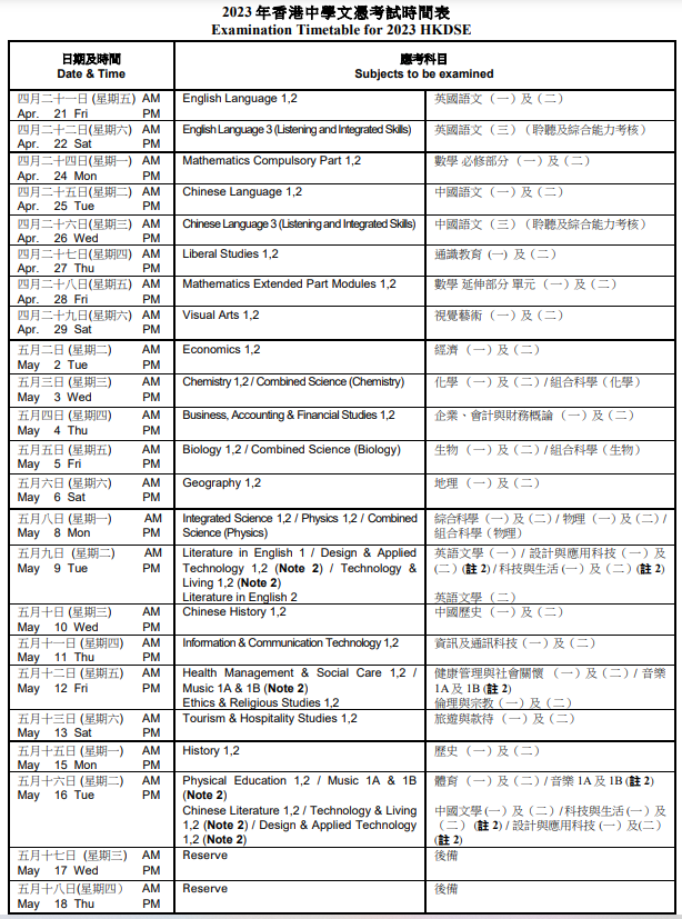 (1)DSE考試科目由4個核心科目加2-3個選修科目組成,大學(xué)錄取以最佳5門或最佳6門計算成績。