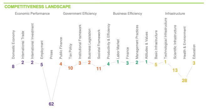 全球競爭力報(bào)告報(bào)告覆蓋了全球67個(gè)經(jīng)濟(jì)體,并對這些國家在經(jīng)濟(jì)表現(xiàn)、政府效率、商業(yè)活力和基礎(chǔ)設(shè)施建設(shè)等四大領(lǐng)域的表現(xiàn)進(jìn)行了全面的評估,包含了164項(xiàng)競爭力指標(biāo)。
