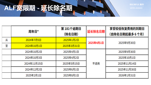 *如果周年日期是周末或公共假期,F(xiàn)SA將在隨后的下一個工作日接受 ALF 申請,不會受到任何處罰,但這不會改變除名日期的計(jì)算或較低的恢復(fù)費(fèi)用期限。