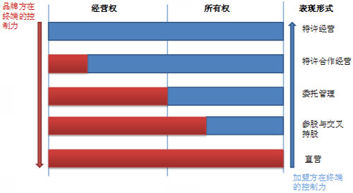在這張圖里,我們大致可以看出品牌公司在對(duì)終端五種不同的方式控制路徑下,他們的風(fēng)險(xiǎn)-成本與收益的組合。連鎖公司經(jīng)營(yíng)的初期往往會(huì)注重終端的數(shù)量而非質(zhì)量,所以會(huì)選擇較小的收益與較低的風(fēng)險(xiǎn)-成本,當(dāng)終端“圈地”完成之后,重點(diǎn)則轉(zhuǎn)入單店的贏利能力和單店帶給公司的營(yíng)業(yè)收入。我們說沒有一種愛情是最好的,不同的階段可能會(huì)欣賞不同的戀愛方式,品牌公司也是如此,最重要的還是要根據(jù)自己自身資源與能力,在公司戰(zhàn)略的指引下選擇一種或是幾種的連鎖組合。