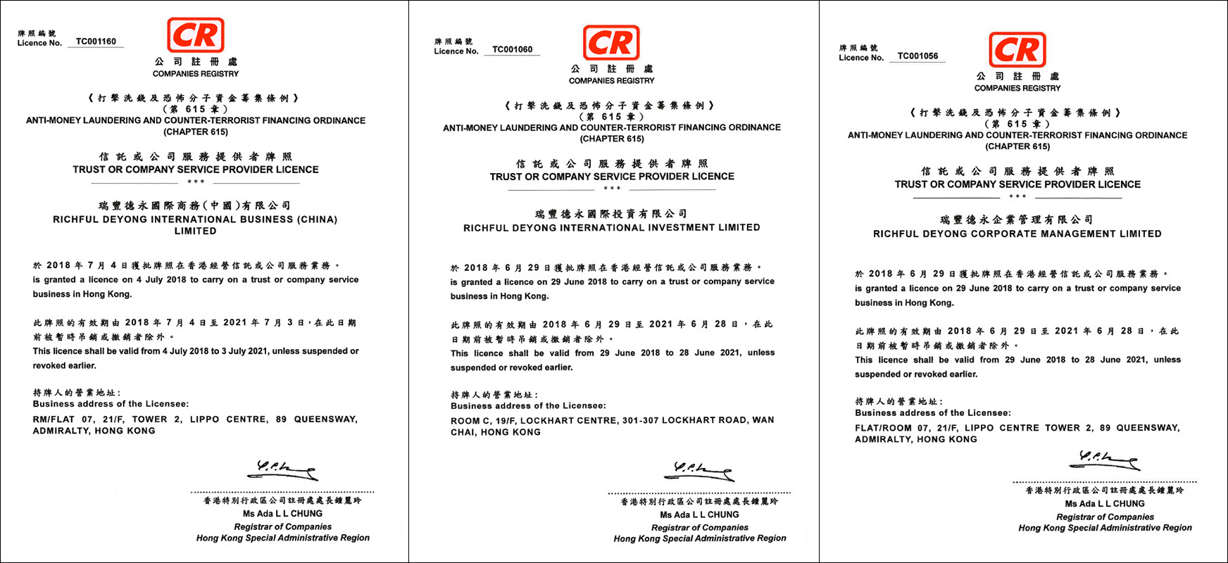 信托或公司服務(wù)提供者牌照:TC001160、TC001060、TC001056