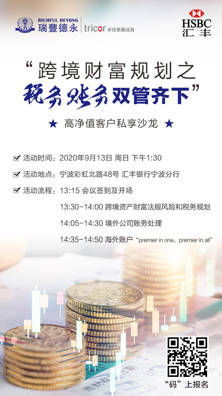 9月13日,瑞豐德永為高凈值客戶特設(shè)「跨境財富規(guī)劃至稅務(wù)賬務(wù)雙管齊下」主題私享沙龍,對高凈值人士常涉及的跨境財富法規(guī)風(fēng)險和稅務(wù)規(guī)劃、境外公司賬務(wù)處理與海外賬戶的相關(guān)稅務(wù)賬務(wù)項目進(jìn)行講解,誠邀您參與并出席共同探討。
