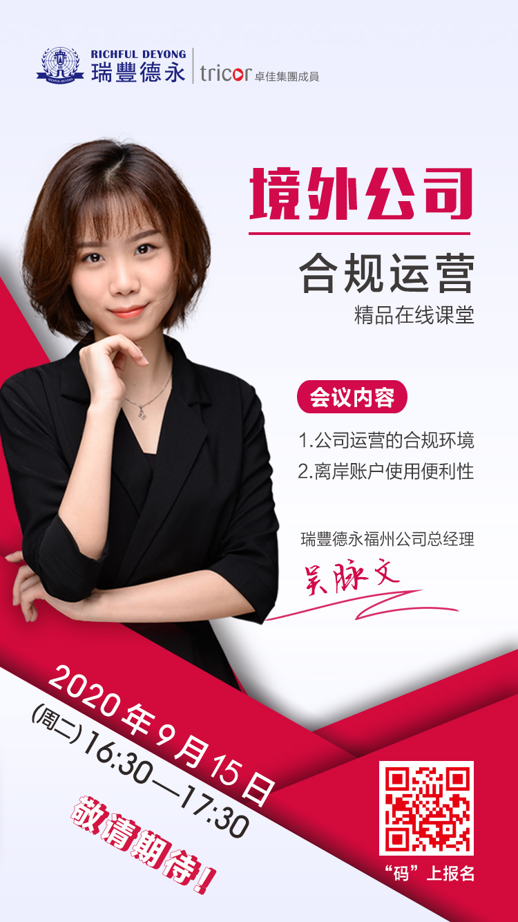 為了更好地引導(dǎo)企業(yè)規(guī)范海外經(jīng)營合規(guī)管理工作,提高企業(yè)國際競爭力,推動企業(yè)持續(xù)提升合規(guī)管理水平,9月15日,瑞豐德永特別安排「境外公司合規(guī)運(yùn)營」線上研討會,在此我們特別邀請您參與一同探討。